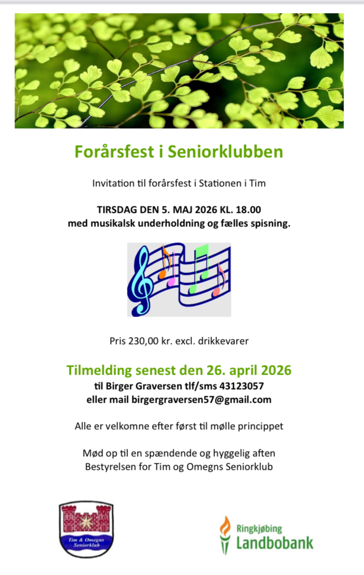 Forårsfest i Seniorklubben tilmelding senest 26. april 2026